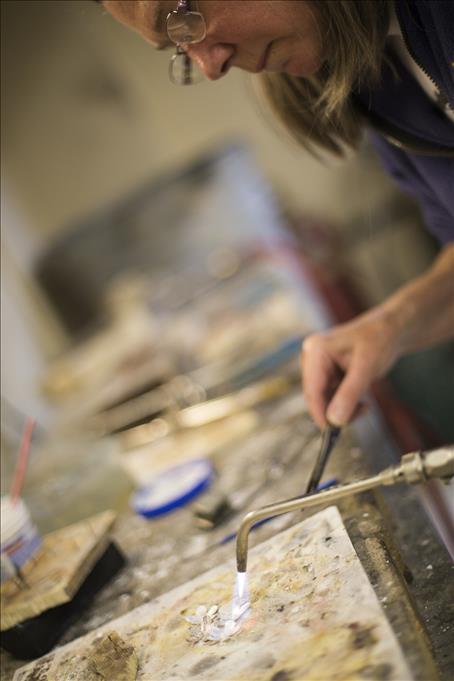 A student uses an annealing torch to increase the ductility of her silver works-in-progress as part of UAA's metalsmithing and jewelry class (Photo by Ted Kincaid/University of Alaska Anchorage).