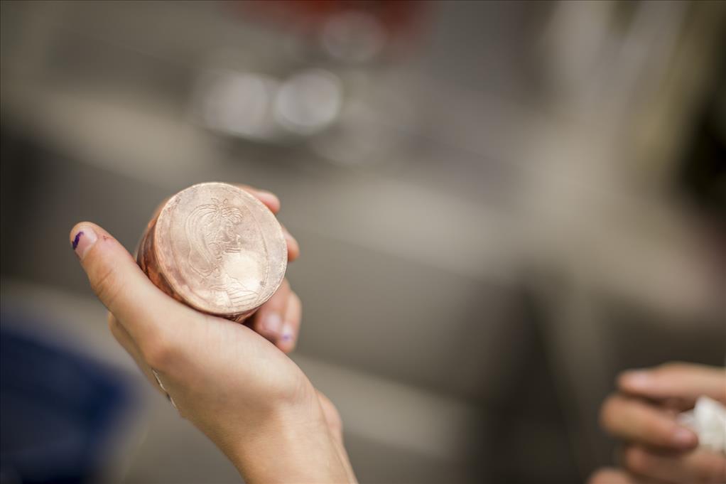 Art major Jenna Gerrety prepares a design for acid etching. The circular piece is made from repurposed radio parts (Photo by Ted Kincaid/University of Alaska Anchorage).
