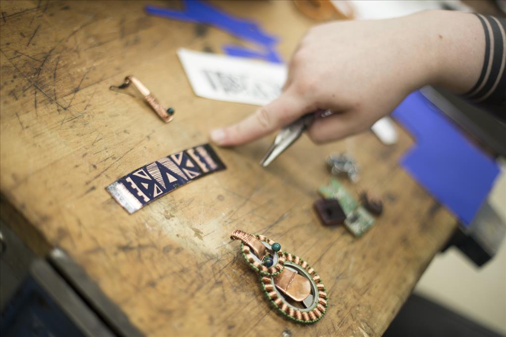 Follow the sound of constant sawing through the Fine Arts Building, down a hallway lined with charcoal sketches and painted figures and into the sculpture lab. There, a dozen students fill the blocky wooden worktables, hammering away at slivers of silver, copper and brass. There's the familiar sound of a blowtorch firing up in the corner and an unfamiliar sharp squeak whenever a student drops hot copper in cool water. And through it all, there's that sound of constant sawing, scraping and filing as students craft metal into jewelry.