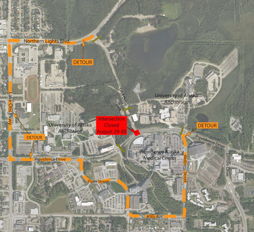 During the weekend of Aug. 29 and 30, the Municipality of Anchorage's street maintenance division will conduct a full closure of the Providence Drive and UAA Drive intersection. The closure will be in effect from 6 a.m. Saturday to 6 p.m. Sunday. This closure is to repave the road surface.