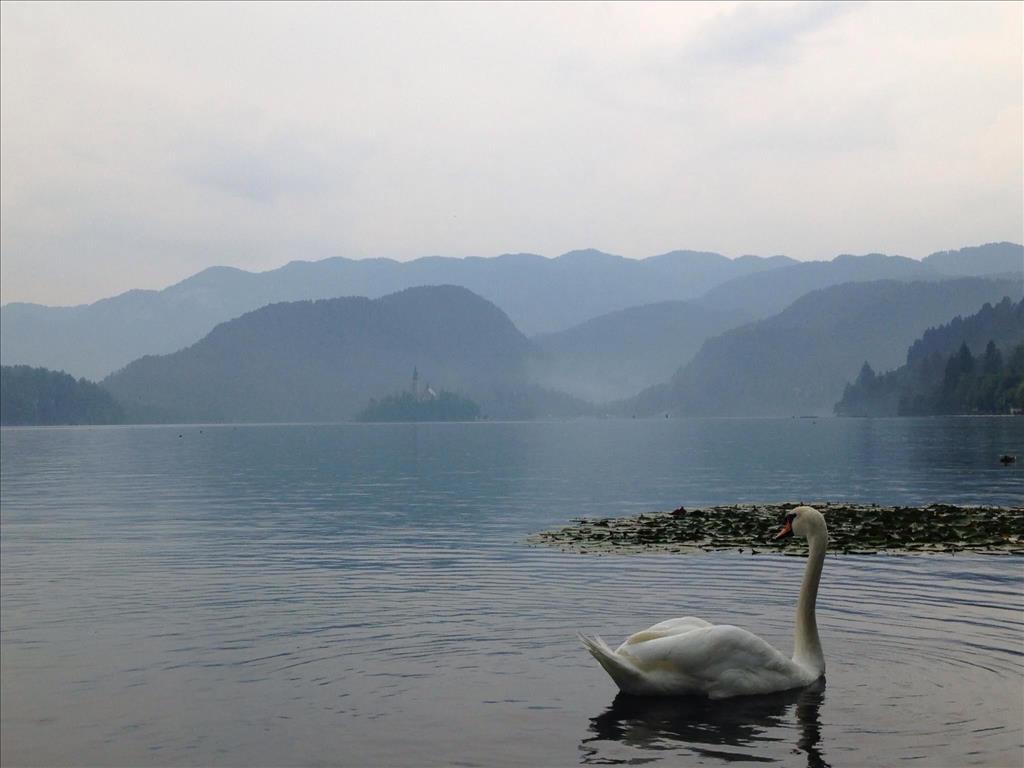 A wandering swan looks out across at the island church in the center of Lake Bled, in the Slovenian Alps (Photo courtesy of UAA Athletics).
