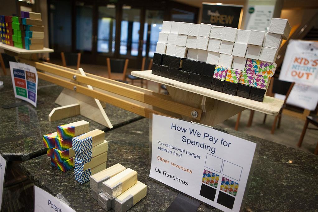 Students weren't due back for a week, so the building lobby was oddly quiet. Undeterred, the trio quickly pulled together empty tables and set up their "Alaska Economy Game," loaded with an oil-price roulette wheel, a giant scale for balancing the budget, and wooden blocks representing state economic assets-everything from savings to oil income, to cigarette and alcohol taxes, to fish license fees and fuel taxes; even prospective income from marijuana sales.