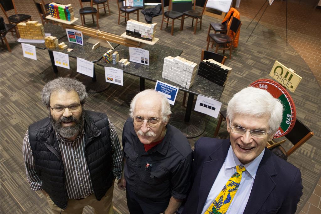From the left, Bob Loeffler, Scott Goldsmith, and Cliff Groh pose for a photo with the Alaska Budget Game in the Administration Building on the University of Alaska Anchorage campus in Anchorage, Alaska Monday, Jan. 4, 2016. (Photo by Philip Hall / University of Alaska Anchorage)