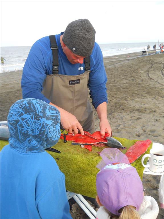 Mueller, teaching his son Noah age 8, and daughter Summer age 5 how to work with sockeye salmon the family caught while dipnetting at Kenai City Beach just north of Kenai River. (Photo provided by Mike Mueller / University of Alaska Anchorage)
