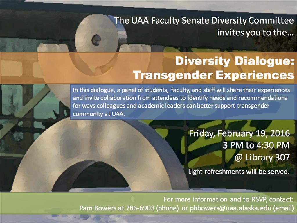 Pam Bowers, Ph.D., M.S.W., has joined together with the UAA Faculty Senate Diversity Committee to present Transgender Experiences. In this dialogue panel, students, faculty and staff will discuss terminology, personal experiences, suggestions for changes at the university and how to engage in gender discussion, as well as provide educational resources and research. It is open to all.