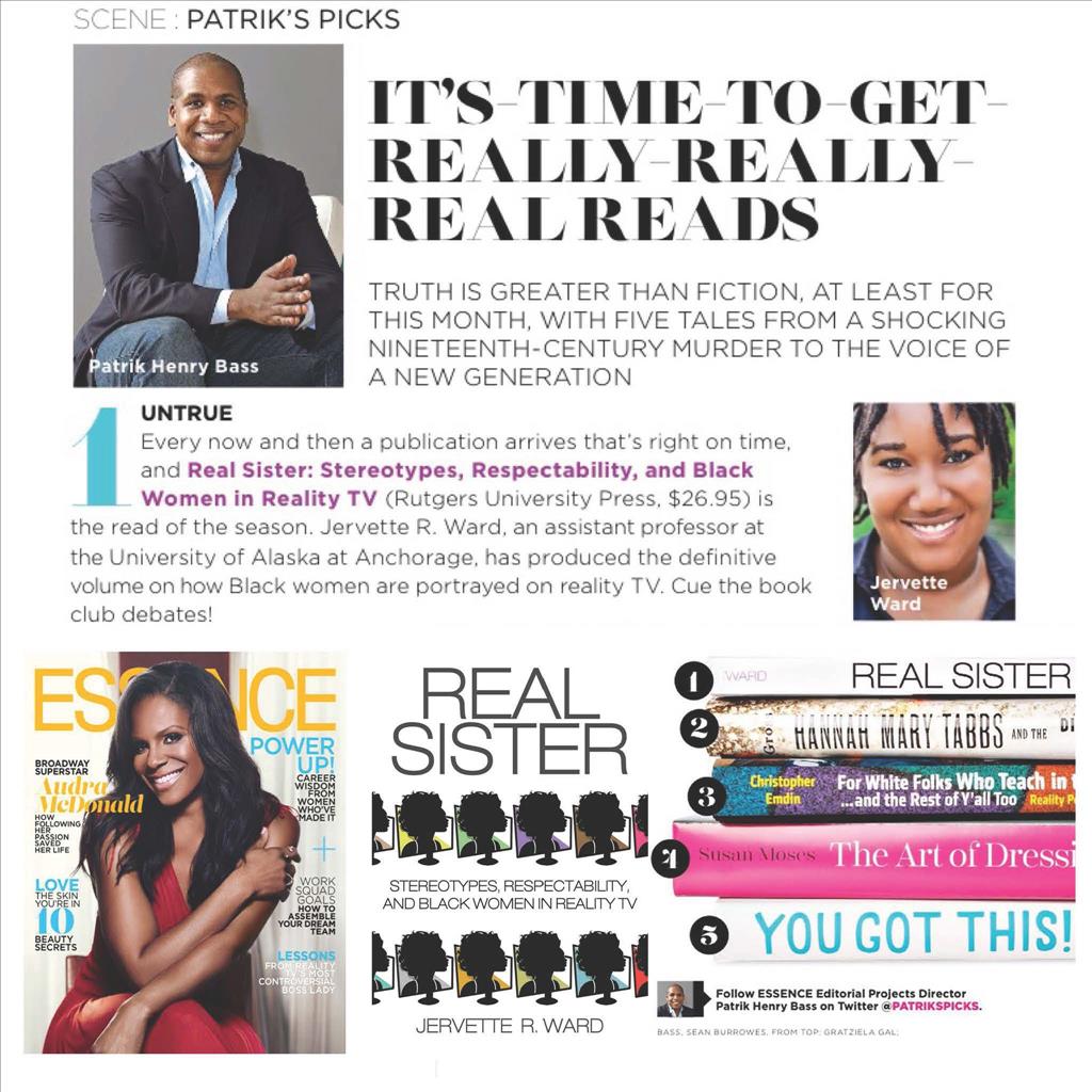 Her edited collection, "Real Sister: Stereotypes, Respectability, and Black Women in Reality TV, " has been recommended as the #1 book in the Patrik's Picks column in the April 2016 issue of Essence Magazine. The blurb reads: "Every now and then a publication arrives that's right on time, and Real Sister: Stereotypes, Respectability, and Black Women in Reality TV is the read of the season. Jervette R. Ward, an assistant professor at the University of Alaska at Anchorage, has produced the definitive volume on how Black women are portrayed on reality TV. Cue the book club debates!"