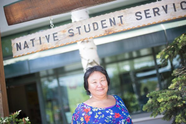 Eva Gregg stands before the Native Student Services center where she presented her Native cultural identity ePortfolio to a group of elders and community workers. NSS is working with community members to make this digital storytelling tool culturally relevant. (Photo by Ted Kincaid / University of Alaska Anchorage)