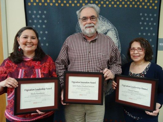 The cultural identity intiiative spearheaded at UAA has attracted national attention. Sheila Randazzo, Willie Templeton and Carol Turner with the Digication awards they received for their vision and support of how individual student ePortfolios can showcase Native cultural values. (Photo courtesy of Digication™)