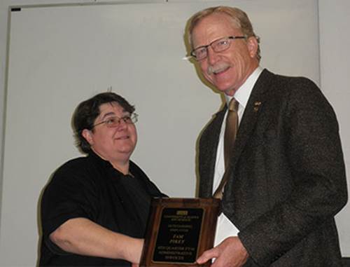 Tam Pikey accepts the Employee of the Quarter Award from Vice Chancellor for Administrative Services Bill Spindle.