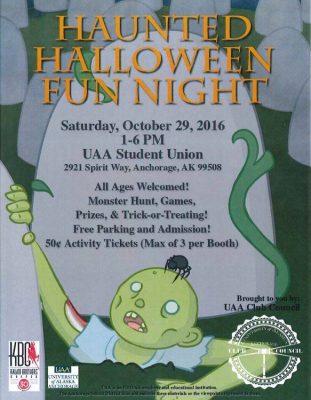 Haunted Halloween Fun Night (HHFN) has been a safe and warm alternative to trick-or-treating for more than 25 years. Each year, student clubs/organizations completely take over the Student Union and are given the opportunity to host a Halloween-themed activity for the Anchorage community. Each organization is allowed to set its own ticket price, raising money for both their club and for charity. In 2015, HHFN brought in $1,742 for St. Jude Children's Research Hospital. This year's event will benefit Big Brothers Big Sisters of Alaska.