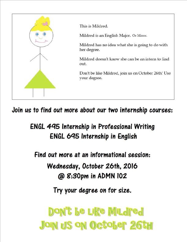 internship specialist) and several former interns for an informational session on Wednesday, Oct. 26, at 8:30 p.m. in Administrative/Humanities Building, Room 102. The session is open to all students (English majors, English minors, other students