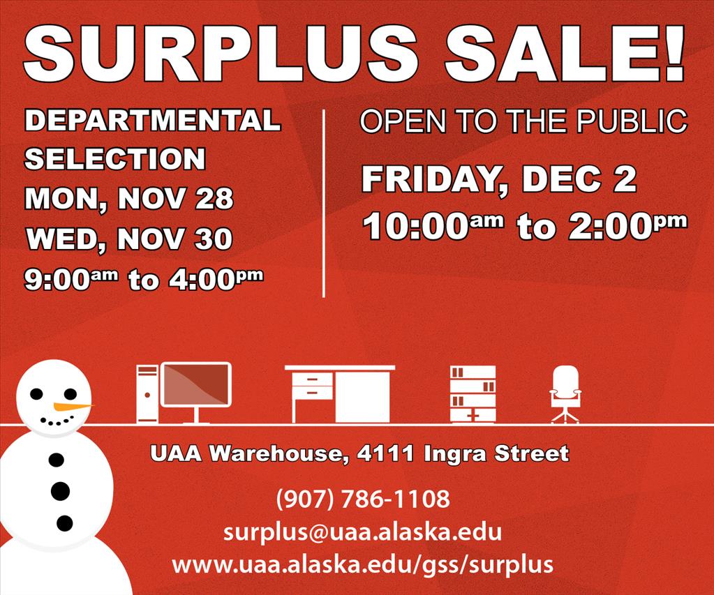 Don't miss the December Surplus Sale. Shop for great deals on furniture, electronics and more. Drop by the UAA Warehouse any time between 10 a.m. and 2 p.m. to browse the selection. This event is open to the public.