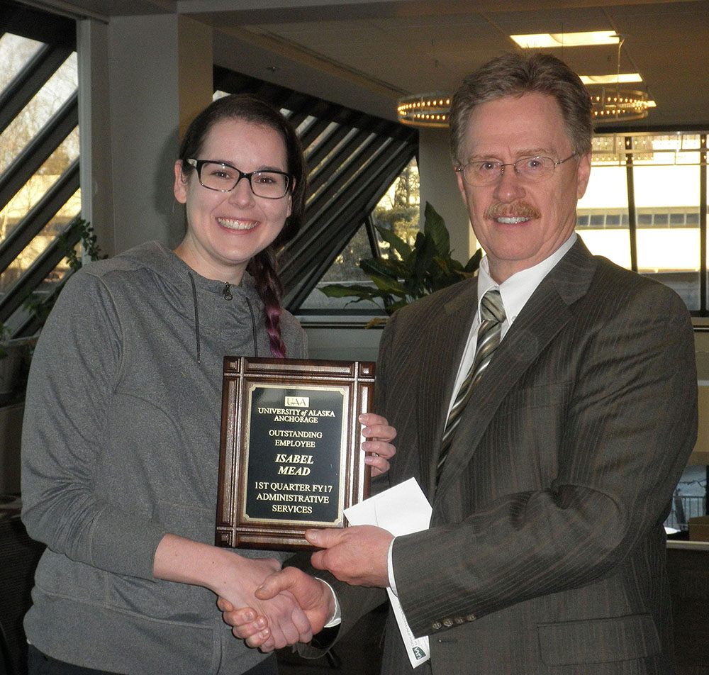 Isabel Mead receives the Employee of the Quarter Award from Pat Shier, interim vice chancellor for Administrative Services.