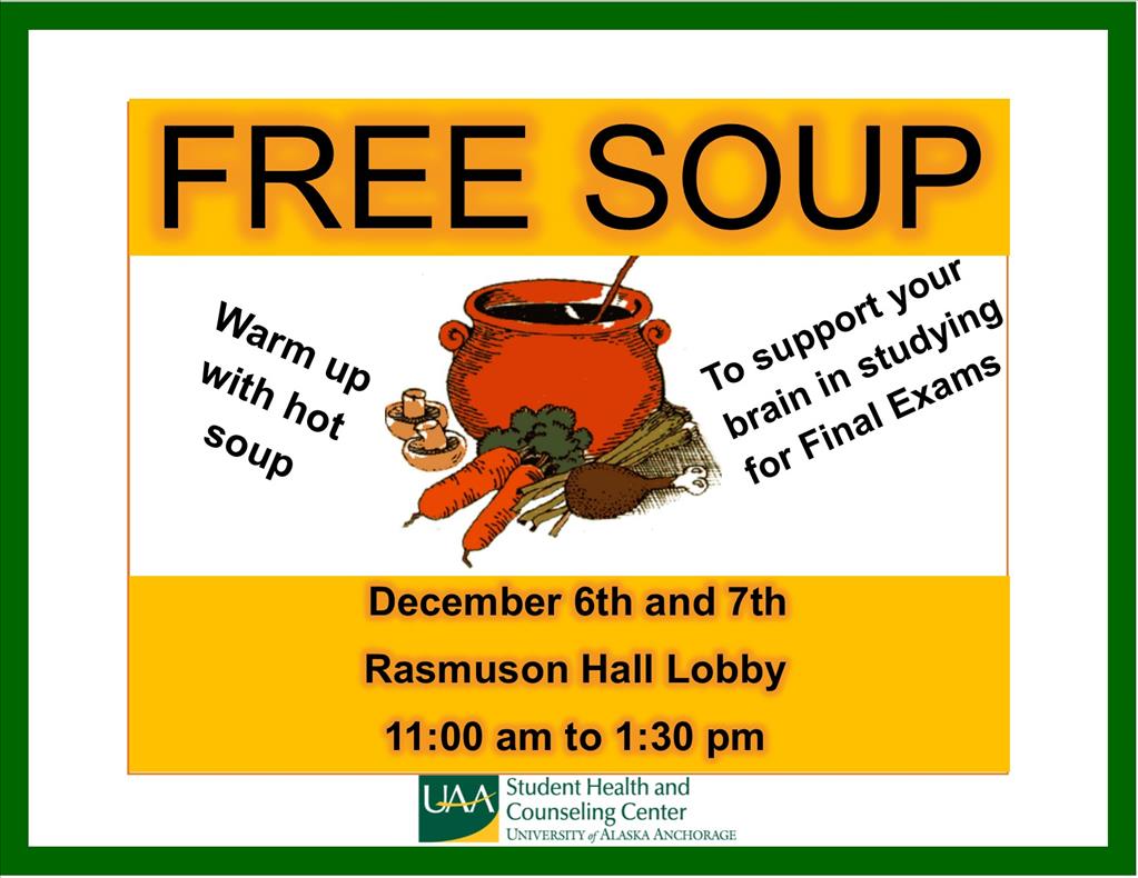 Warm up with hot soup to support your brain in studying for final exams. Presented by the UAA Student Health and Counseling Center.