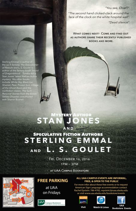 Mystery Author Stan Jones and Speculative Fiction Authors Sterling Emmal and L. S. Goulet Friday, Dec. 16, 1-3 p.m. UAA Campus Bookstore
