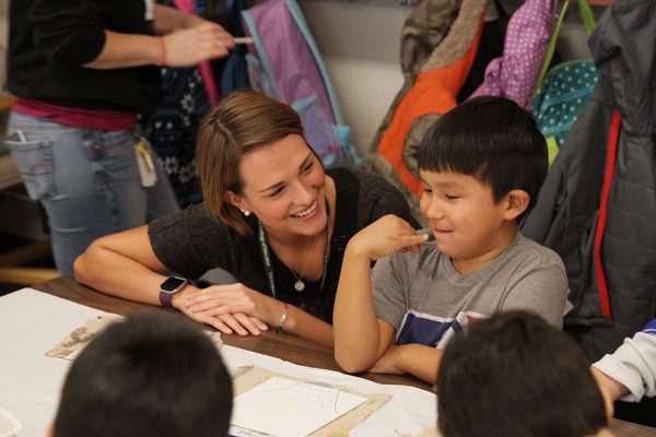 UAA student teacher Olivia Wito talks with Ashley Oktollik, a student in a K-1 classroom at Lake Otis Elementary School. That school and four others in the Anchorage School District will soon take part in 'The Northern Journeys', a project aiming to help teachers and preservice teachers integrate the arts into their classrooms and learn to be more culturally responsive. (Photo by Mike Belloni, ASD)