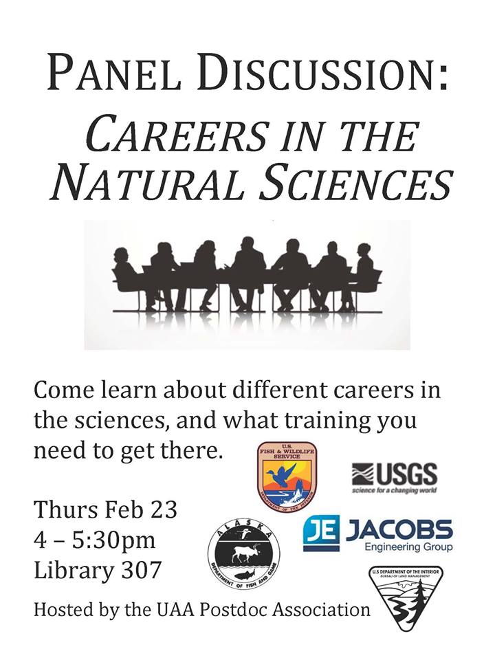 Come learn about different careers in the sciences, and what training you need to get there. This talk is free and open to all. Hosted by the UAA Postdoc Association.