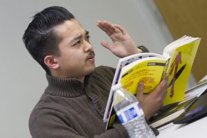 Amiel Pineda discusses the graphic novel Watchmen during class. (Photo by Philip Hall / University of Alaska Anchorage)