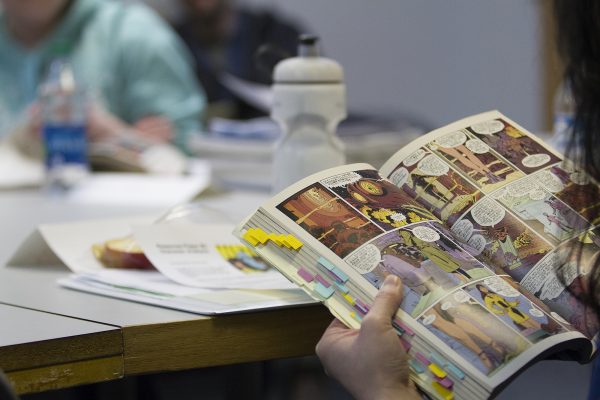 A student reads Watchmen in an Honors College class based on the graphic novel. (Photo by Philip Hall / University of Alaska Anchorage)