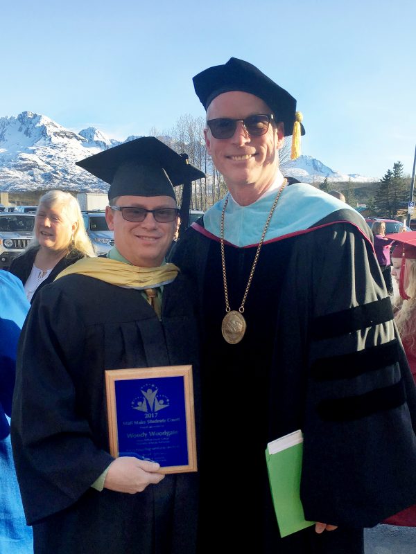 Please join us in congratulating Wayne "Woody" Woodgate, UAA recipient of the 2017 Staff Make Students Count Award. Woody is a former teacher who recently took over as coordinator for the Adult Basic Education program at Prince William Sound College and revitalized it with his passion for helping others. Under his guidance, the ABE program has increased student contacts and helped encourage students to declare majors and commit to their education. Woody is known among his colleagues for his dedication to student success, his incredible work ethic and his boundless positive energy. Woody was presented with his award at the May 10 Prince William Sound College commencement ceremony.