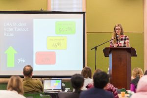 Journalism and Communication Department term professor Marsha Schirack-Olson presents her Fundamentals of Oral Communication class project on raising voter issues and registration among millennial students at UAA. (Photo courtesy of UAA Center for Community Engagement and Learning)