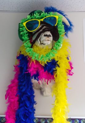 His classroom wall decorations - inspiring, educational, goofy - mirror his teaching style. There's a Dall sheep in Hawaiian leis in the corner, and animal posters with added speech bubbles telling kids to stop looking at the walls and pay attention. Collaborative lab tables border the room, with rows of desks in the center.