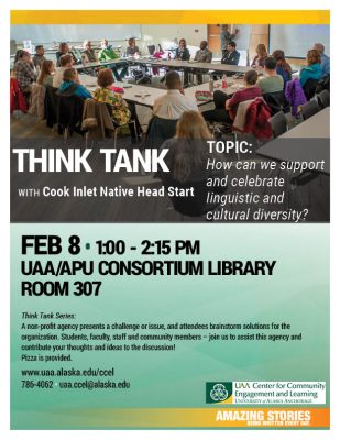 Think Tank: How can we support and celebrate linguistic and cultural diversity? with Cook Inlet Native Head Start Thursday, Feb. 8, 1-2:15 p.m. UAA/APU Consortium Library, Room 307