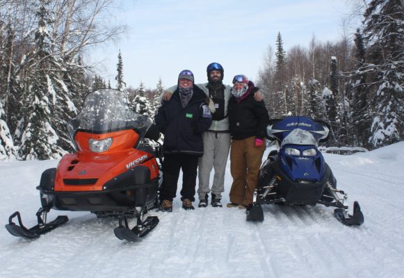 Miller with physical education seniors Robert Forto, left, and Miranda Sheely, who helped deliver guests and gear to the cabin via dog-sled and snow machine. (Photo by J. Besl / University of Alaska Anchorage)