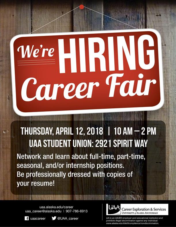 The last career fair for this school year, 2018 UAA We're Hiring! Career Fair, will take place this Thursday, April 12 in the UAA Student Union (2921 Spirit Way).