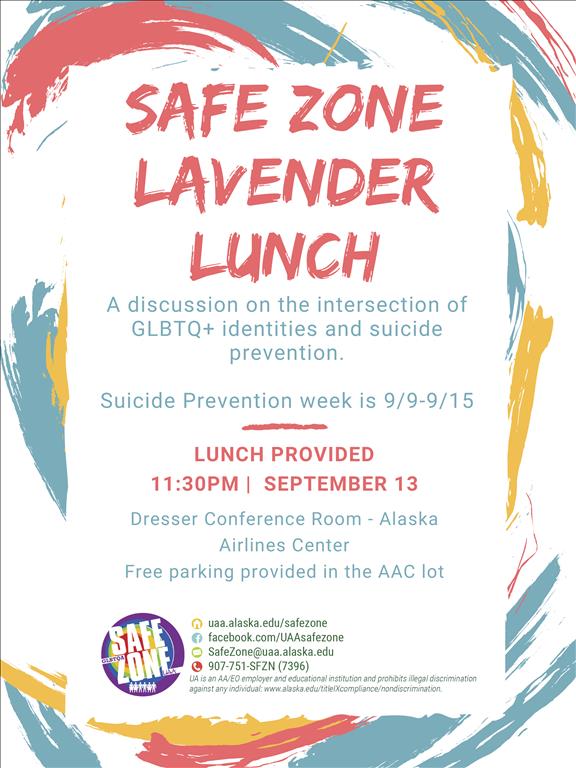 Join SafeZone for a discussion on the intersection of GLBTQ+ communities and suicide. Lunch is provided. Free parking available in AAC main lot.