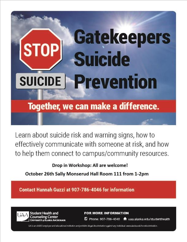 Learn about suicide risk and warning signs, how to effectively communicate with someone at risk, and how to help them connect to campus and community resources. Let's create a safer UAA together.