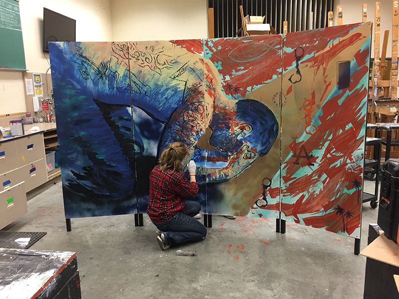 Steve Gordon, an adjunct professor of painting, has designed several projects in his beginning painting classes in which groups of student work together to paint murals that depict difficult topics such as the opioid crisis, sexual assault, and the Syrian refugee crisis.