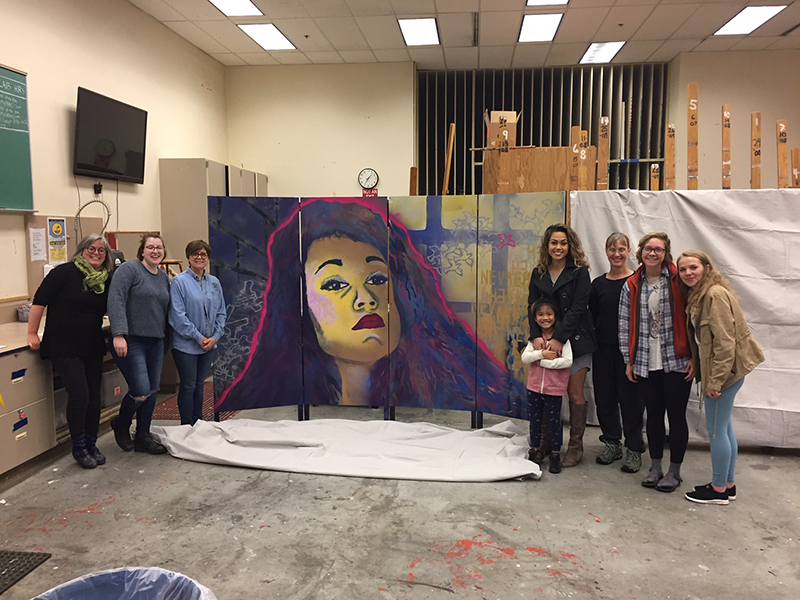 UAA art students Arlitia Jones, Sutton Moore and Pam Butcher, joined by ACE guest Tara and her daughter Neveah, along with UAA art students Nancy Perry, Torie Jarocki and Claire Faulker present their finished portrait for the ACE's Mural Project.