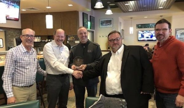NMS President Matthew Daggett and Safety Specialist Matt Pawlak presented the Industry Leader Award to the Seawolf Dining management team at the Varsity Sports Grill on Friday, Nov. 9, with several UAA leaders in attendance.