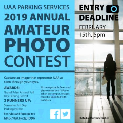 Submitted photos will be selected by UAA Parking Services staff during the week of Feb. 25. Winners will be announced Tuesday, March 5.