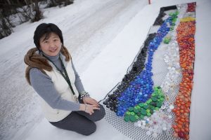 Herminia Din, UAA professor of art, art education and art appreciation, poses next to her art installation during Winterfest in 2014. Din has spent more than a decade using art as a way to rethink how we can turn junk into art and reduce plastic waste. (Photo by Phil Hall/ University of Alaska Anchorage)