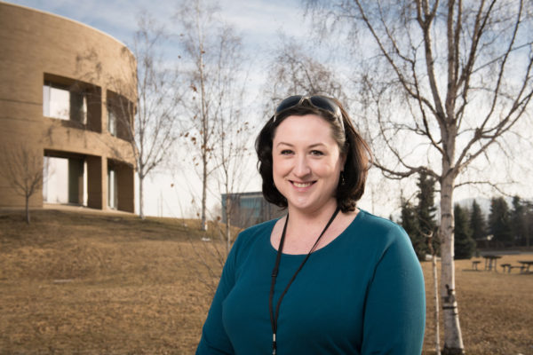 Rebecca Barker, M.S.W. '17, is the first in-house community resource coordinator for the Loussac Library. In this role, Barker serves as a conduit, making it easier for people to connect to the appropriate community agencies. (Photo by James Evans / University of Alaska Anchorage)