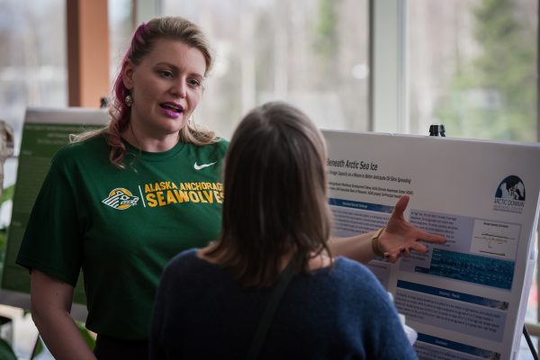 Arctic Domain Awareness Center Workforce Development Fellow Kelsey Frazier discusses her project "Oil Beneath Sea Ice: Predicting Storage Capacity as a Means to Better Anticipate Oil Slick Spreading" at the poster presentation for UAA's 14th Annual Undergraduate Research & Discovery Symposium in the spine. (Photo by James Evans / University of Alaska Anchorage)