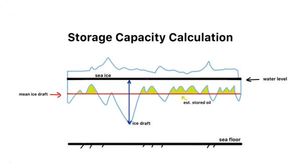 It all depends on ice stage, determined by age and thickness. Older ice - the kind that sticks around for multiple years - has a greater storage capacity; its underwater geometry is more complex after more time rattling and smashing on the tides. Rougher ice means more natural cavities where rising oil might be trapped, like bubbles under a pool float.