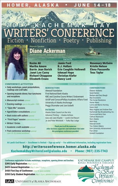 This year's conference, June 14-18 at Land's End Resort in Homer, will feature daily workshops, readings, craft talks and panel presentations in fiction, poetry, nonfiction and the business of writing. Award-winning poet, essayist and naturalist Diane Ackerman will serve as the keynote speaker.