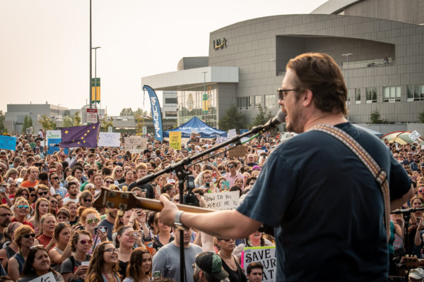 Zachary Carothers of Grammy-winning Alaska rock band Portugal. The Man overlooks the crowd at the Alaska Airlines Center as they perform during a rally to override Gov. Dunleavy's budget vetoes. (Photo by James Evans / University of Alaska Anchorage)