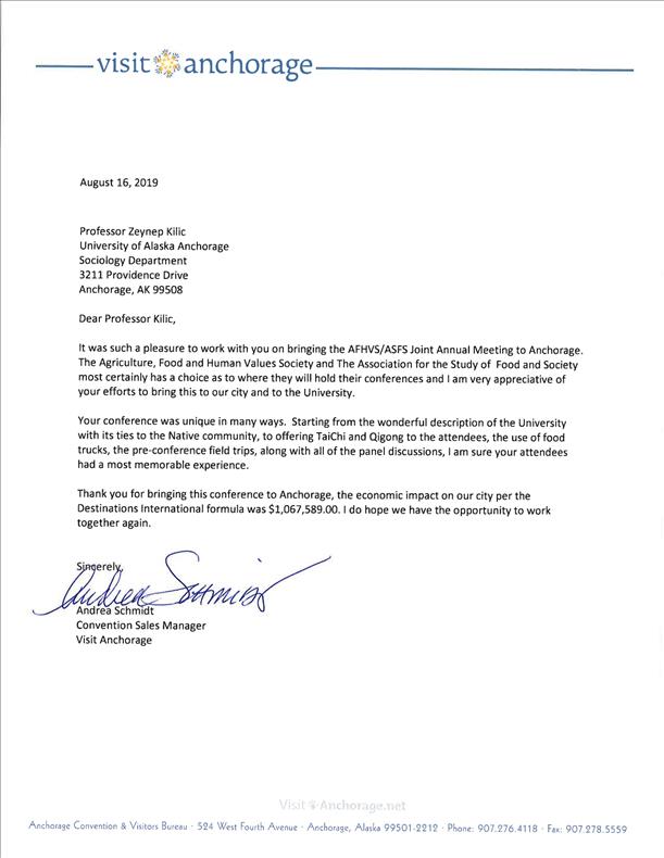 UAA hosted the Agriculture, Food and Human Values Society (AFHVS)/Association for the Study of Food and Society (ASFS) joint annual meeting June 26-29, 2019. According to Visit Anchorage, the conference's economic impact on the city was $1,067,589.