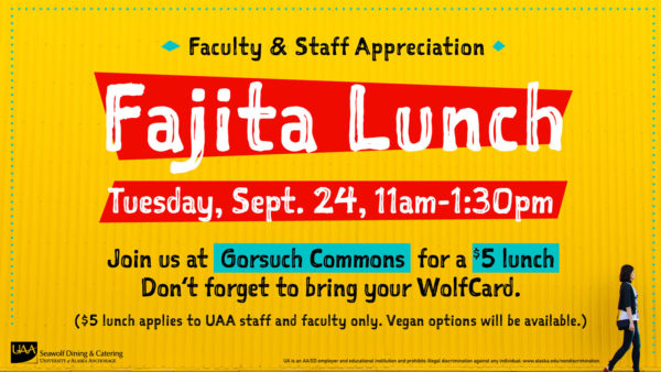 Seawolf Dining invites the UAA staff and faculty to join us at Creekside Eatery for a $5 fantastic fajita luncheon on Tuesday, Sept. 24. This will also be an opportunity to get a pre-sale application for a Campus Meal Plan PFD special. Come anytime during the lunch service (11 a.m.-1:30 p.m.) and bring a friend!