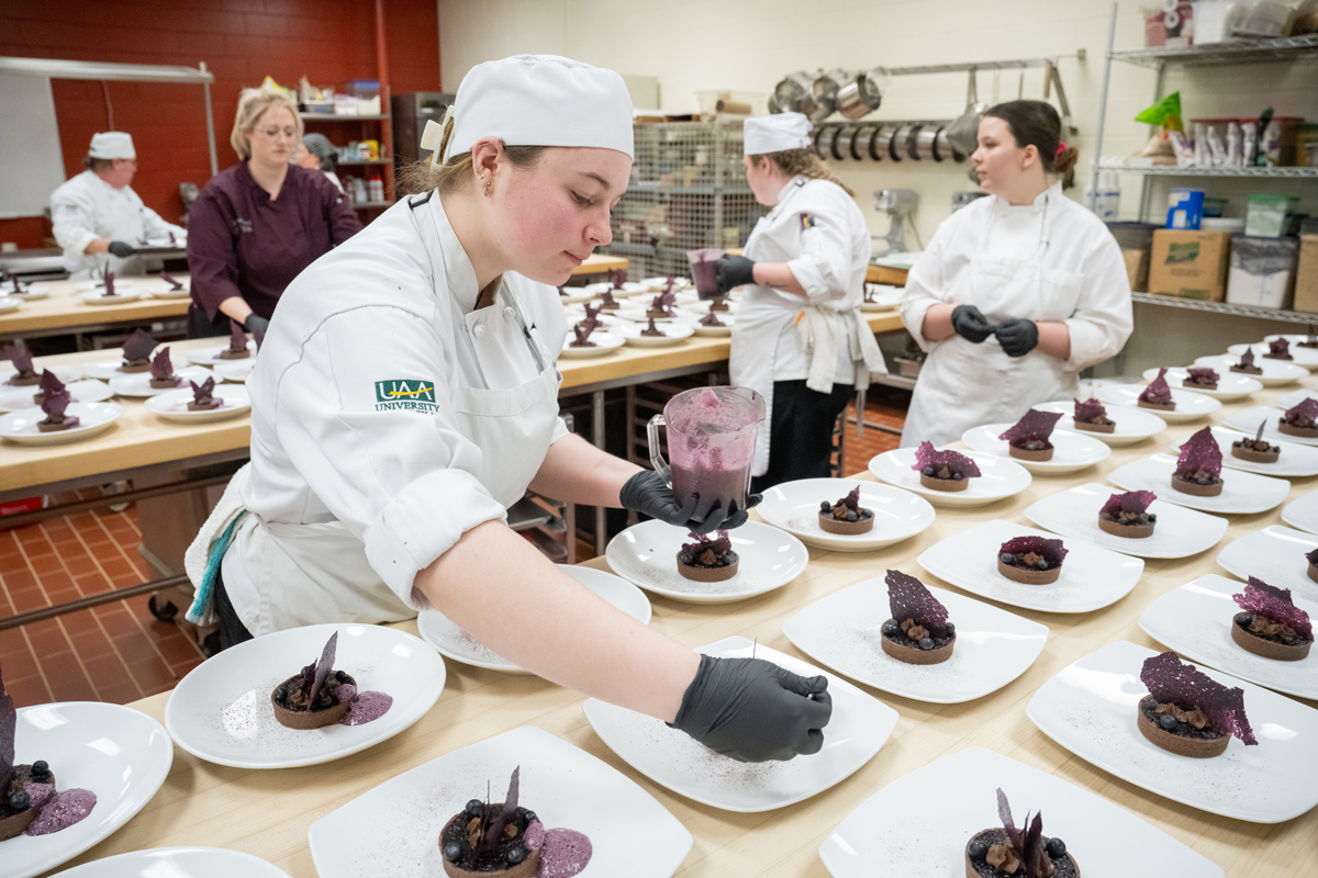 Patrick Hoogerhyde served as this year's celebrity chef. Raised on subsistence fishing and wild game in King Salmon, he most recently oversaw all aspects of Bridge Seafood as a managing partner prior to selling the business in 2023. Five additional chefs led the student teams for each course: Chef Heather Houck, Wild Fork Catering (hors d'oeuvres); Chef Frazer Buchanan, The Rustic Goat (salad); Chef Bobby Richards, Mt. McKinley Princess Wilderness Lodge (fish); Chef Brett Knipmeyer, Kinley’s Restaurant & Bar (main); and UAA alumna and professional pastry chef Samantha Wagner (dessert). Sommelier Michelle Smith selected the wine pairings for each course.