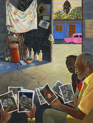 Reinaldo, also known as Robinson, was a respected keeper of community knowledge and cultural memories. One could almost always find him holding forth with a neighbor or a visitor to the altars. Reinaldo is shown in the lower right, sitting with a neighbor viewing photos taken by Jill Flanders Crosby in Dzodze, Ghana. Jill brought the photos especially to show Robinson the similarities between ritual objects in the two communities, thus helping establish a possible historical link. This painting is a companion piece to "The Women of Dzodze Viewing Photos from Perico".